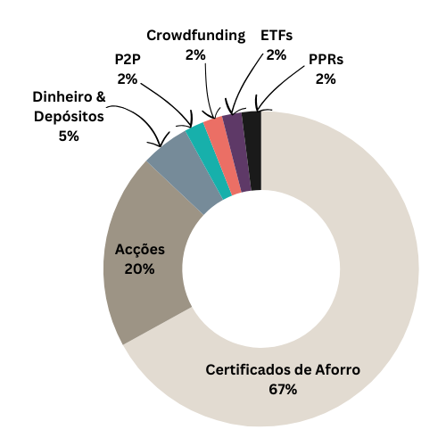 - O maior activo continua a ser os Certificados de Aforro – Série E com cerca de 67% de alocação. Como já os subscrevi em 2022, estão a render 4% ao ano (taxa normal + 0.5% de prémio de permanência). Acho um valor bastante razoável para capital garantido (a não ser que o Estado Português vá a falência) e enquanto as taxas de juro permanecerem altas, não tenciono alterar esta situação. É aqui que está o meu fundo de emergência mais alargado.